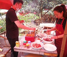 在山庄可以吃柴火鸡,烤烧烤(二选一),还可以免费进行以下活动:自行采摘《大五星枇杷》,巜龙泉水蜜桃》和采摘巜鸡血李子》,随便吃,喝茶,打麻将,唱KTV,下象棋,围棋,打蓝球,乒乓球,羽毛球,篮球,钓鱼,登山,爬健身步道,玩儿童乐园,团建。